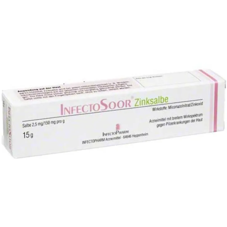 In Infectosoor Zinksalbe wird der gegen Pilz helfende Wirkstoff mit Zink kombiniert. Zink hilft, die befallene Haut zu trocknen und die Entzündung zu lindern. Infectosoor Zinksalbe wird bei Entzündungen der Haut und Hautfalten durch Hefepilze (Candida), wie z.B. Windelsoor bei Babys angewendet.