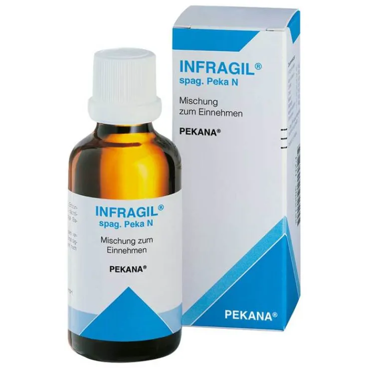 INFRAGIL® spag. Peka N Tropfen. Registriertes homöopathisches Arzneimittel, daher ohne Angabe einer therapeutischen lndikation. Enthält 22 Vol.-% Alkohol. / 5 Tropfen = 0,0286 g Alkohol. Gegenanzeigen: Keine bekannt. Wechselwirkungen: Keine bekannt. Nebenwirkungen: Keine bekannt. Allgemeiner Hinweis: Die Wirkung eines homöopathischen Arzneimittels kann durch allgemein schädigende Faktoren in der Lebensweise und durch Reiz- und Genussmittel ungünstig beeinflusst werden. Falls Sie sonstige Arzneimittel einnehmen, fragen Sie Ihren Arzt. Vorsichtsmaßnahmen und Warnhinweise: Zur Anwendung dieses Arzneimittels bei Kindern unter 12 Jahren liegen keine ausreichend dokumentierten Erfahrungen vor. Es sollte deshalb bei Kindern unter 12 Jahren nicht angewendet werden. Da keine ausreichend dokumentierten Erfahrungen zur Anwendung in der Schwangerschaft und Stillzeit vorliegen, sollte das Arzneimittel nur nach Rücksprache mit dem Arzt angewendet werden.