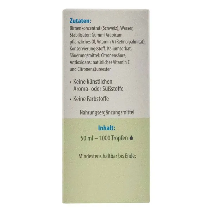 Birnenkonzentrat (Schweiz), Wasser, Stabilisator: Gummi Arabicum, pflanzliches Öl, Vitamin A (Retinolpalmitat), Konservierungsstoff: Kaliumsorbat, Säuerungsmittel: Citronensäure, Antioxidans: natürliches Vitamin E und Citronensäureester.