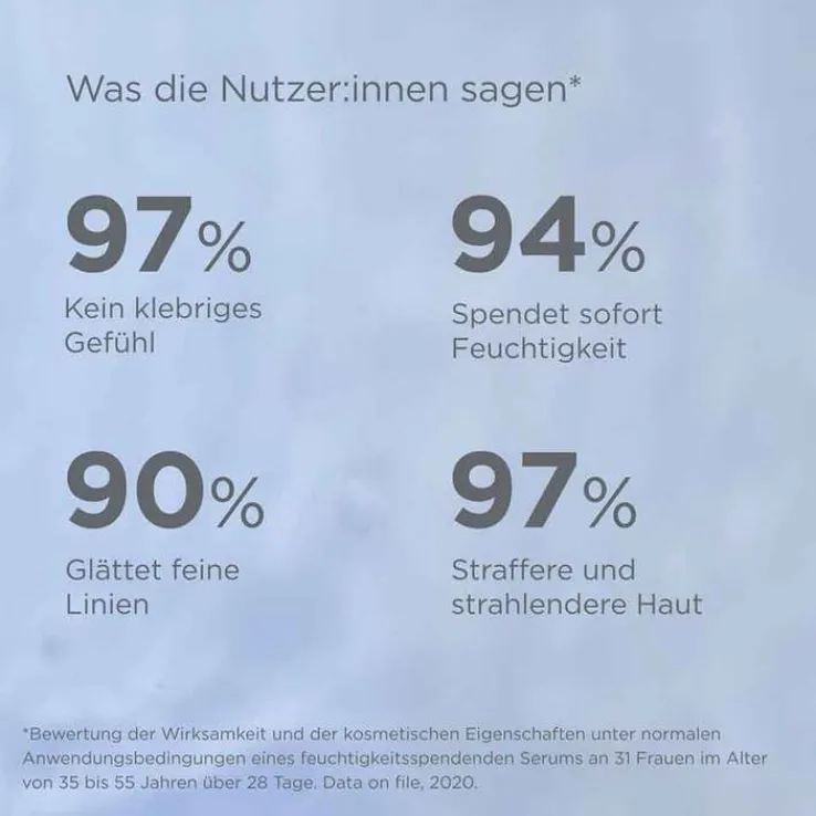 ¹ Bewertung der Wirksamkeit und der kosmetischen Eigenschaften unter normalen Anwendungsbedingungen eines feuchtigkeitsspendenden Serums an 31 Frauen im Alter von 35 und 55 Jahren für 28 Tage. Data on file 2020.