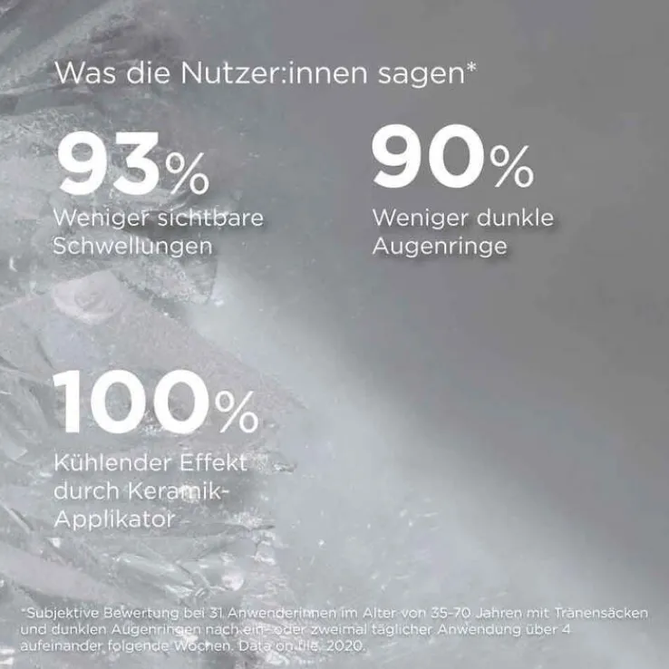 Eyeliss und Haloxyl wirken abschwellend und fördern die Mikrozirkulation, wodurch Schwellungen sichtbar verringert werden. Hyaluronsäure spendet Feuchtigkeit und stellt die Hautelastizität wieder her, während sie feine Linien glättet. Der integrierte Keramik-Applikator sorgt für einen kühlenden Effekt und eine angenehme Massage, die zusätzlich die Haut erfrischt.