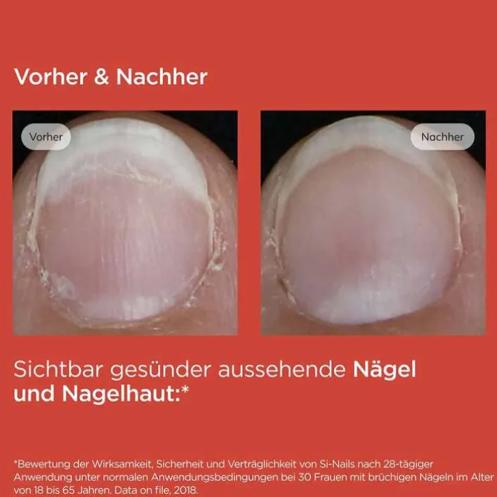 Mit SI-Nails Nagelhärter erleben Sie eine intensive Nagelpflege, die die Nagelstärke und Nagelflexibilität verbessert. Ihre Nägel werden nach 14 Tagen regelmäßiger Anwendung stärker, gesünder und widerstandsfähiger gegen äußere Einflüsse. ¹ SI-Nails fördert das Nagelwachstum, repariert beschädigte Nägel und sorgt für ein gesundes Nagelbild.