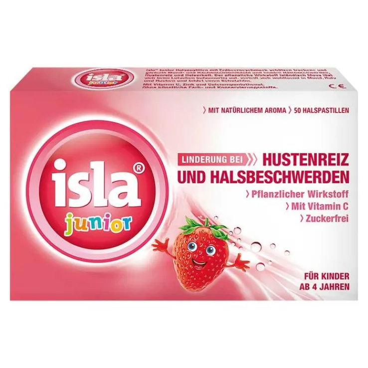 Für kleine Halsschmerz-Patient*innen: Weiche Pastille mit Isländisch Moos Die isla® junior Halspastillen enthalten einen Extrakt aus pflanzlichem Isländisch Moos. Dieser besteht zu 80 % aus Schleimstoffen, die zusammen mit dem Speichel einen Schutzfilm bilden, der sich wie Balsam auf die Mund- und Rachenschleimhäute legt und diese so befeuchtet und vor weiteren Reizen schützt. In der Folge wird die Schleimhautregeneration gefördert und Hustenreiz effektiv gelindert. Daneben sind Vitamin C, Zink und Calciumpantothenat enthalten.