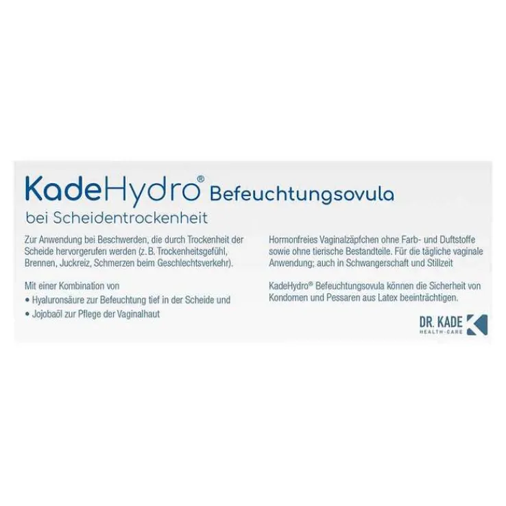 KadeHydro Befeuchtungsovula befeuchten intensiv , pflegen die Vaginalhaut und sind dabei gut verträglich.