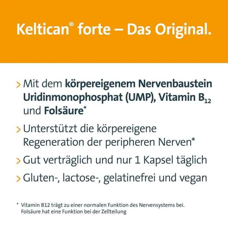 Keltican® forte unterstützt die körpereigene Regeneration der peripheren Nerven* mit essentiellen Nervenbausteinen. Die einzigartigen UMP-B-Pellets mit der Kombination aus Uridinmonophosphat (UMP), Vitamin B12 und Folsäure optimieren die Nährstoff-Versorgung des Körpers für die Nervenregeneration.*