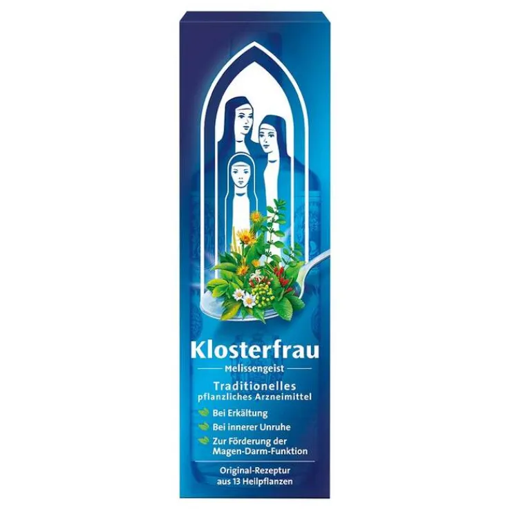 Klosterfrau Melissengeist. Anwendungsgebiete: Traditionelles pflanzliches Arzneimittel angewendet: Innerlich: Zur Besserung des Allgemeinbefindens (bzw. zur Stärkung oder Kräftigung) bei Belastung von Nerven und Herz-Kreislauf mit innerer Unruhe und Nervosität. Zur Förderung der Schlafbereitschaft. Bei Wetterfühligkeit. Zur Besserung des Befindens bei Unwohlsein, zur Förderung der Funktion von Magen und Darm, insbesondere bei Neigung zu Völlegefühl und Blähungen. Zur Besserung des Befindens bei unkomplizierten Erkältungen und zur Stärkung. Äußerlich: Zur Unterstützung der Hautdurchblutung z. B. bei Muskelkater und Muskelver-spannungen. Das Arzneimittel ist ein traditionelles Arzneimittel, das ausschließlich auf Grund langjähriger Anwendung für das Anwendungsgebiet registriert ist. Warnhinweise: Enthält 3,1 g Alkohol (Ethanol) pro 5 ml Flüssigkeit entsprechend 79 % (v/v). Enthält Zimt (Zimtaldehyd). Packungsbeilage beachten. Zu Risiken und Nebenwirkungen lesen Sie die Packungsbeilage und fragen Sie Ihre Ärztin, Ihren Arzt oder in Ihrer Apotheke.