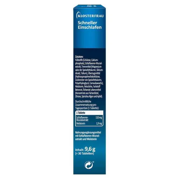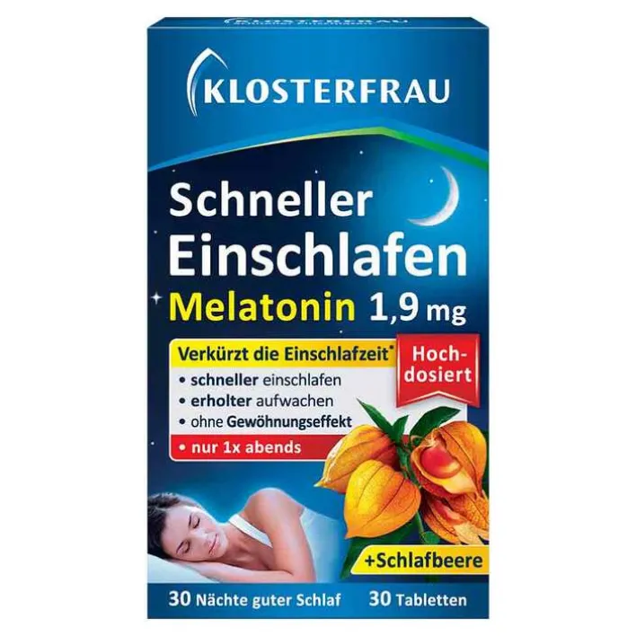 Klosterfrau schneller Einschlafen mit 1,9 mg Melatonin verkürzt die Einschlafzeit.* Melatonin ist ein körpereigener Botenstoff, der den natürlichen Schlaf fördert und den Schlaf-Wach-Rhythmus stabilisiert. Klosterfrau schneller Einschlafen enthält zusätzlich Schlafbeeren-Blätter und -Wurzel Extrakt.