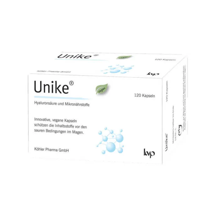 Bei Unike® Kapseln werden innovative, vegetarische Kapseln verwendet. Hierbei handelt es sich um magensaftresistente Kapseln auf Basis pflanzlicher Cellulose. Diese schützen die Inhaltsstoffe, wie z. B. die Hyaluronsäure, vor den sauren Bedingungen im Magen.