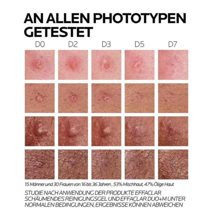 Die Gesichtspflege für unreine, zu Akne neigende Haut mildert Pickel, Mitesser und Pickelmale bereits ab 8 Stunden sichtbar und spendet der Haut gleichzeitig intensive Feuchtigkeit. Dank der hochwirksamen Formulierung bietet Effaclar Duo+M einen Anti-Rückfall-Effekt.