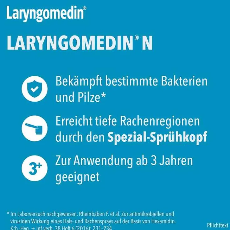 Laryngomedin® N. Wirkstoff: Hexamidindiisetionat. Anwendungsgebiete: Laryngomedin® N wird angewendet zur unterstützenden Behandlung von bakteriellen Entzündungen der Schleimhaut von Mund und Rachen. Zu Risiken und Nebenwirkungen lesen Sie die Packungsbeilage und fragen Sie Ihre Ärztin, Ihren Arzt oder in Ihrer Apotheke.
