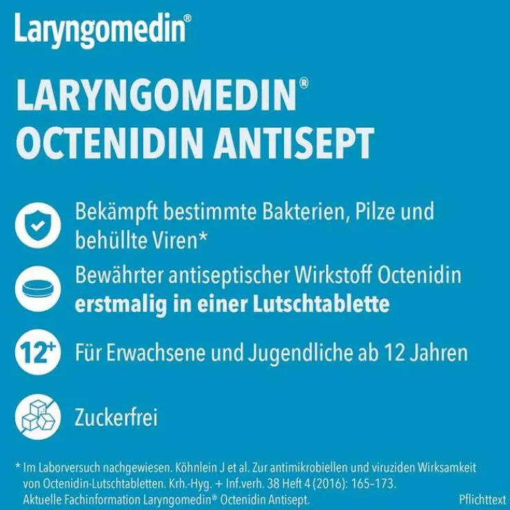 Laryngomedin® Octenidin Antisept Wirkstoff: Octenidindihydrochlorid Anwendungsgebiete: Laryngomedin® Octenidin Antisept wird angewendet zur kurzzeitig unterstützenden Behandlung von Entzündungen der Mund- und Rachenschleimhaut, die mit typischen Symptomen wie Schmerzen, Rötung und Schwellung einhergehen. Laryngomedin® Octenidin Antisept wird angewendet bei Erwachsenen und Jugendlichen ab 12 Jahren. Wenn Sie sich nach 4 Tagen nicht besser oder gar schlechter fühlen, wenden Sie sich an Ihren Arzt. Zu Risiken und Nebenwirkungen lesen Sie die Packungsbeilage und fragen Sie Ihre Ärztin, Ihren Arzt oder in Ihrer Apotheke.