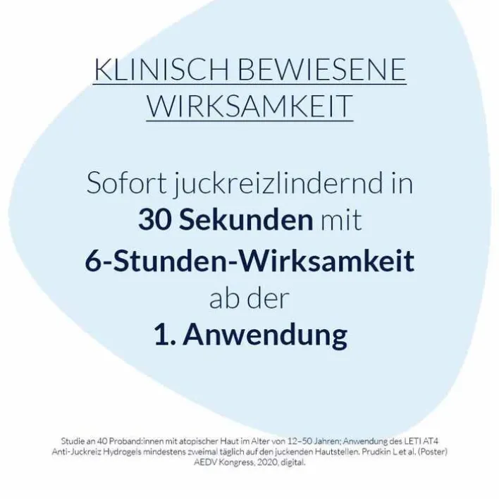 *Studie an 40 Probanden mit atopischer Haut im Alter von 12 – 50 Jahren; Anwendung des LETIAT4 Anti-Juckreiz Hydrogels mindestens zweimal täglich auf den juckenden Hautstellen.