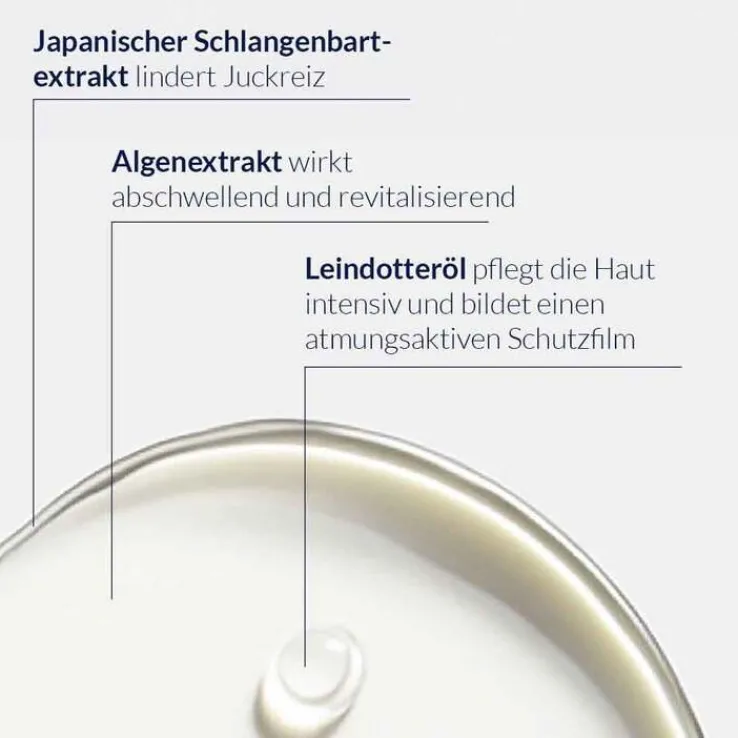 - mit Japanischem Schlangenbart (lindert Juckreiz), Algenextrakt (abschwellend und revitalisierend) und Leindottersamenöl (pflegt die Haut intensiv und bildet einen atmungsaktiven Schutzfilm)