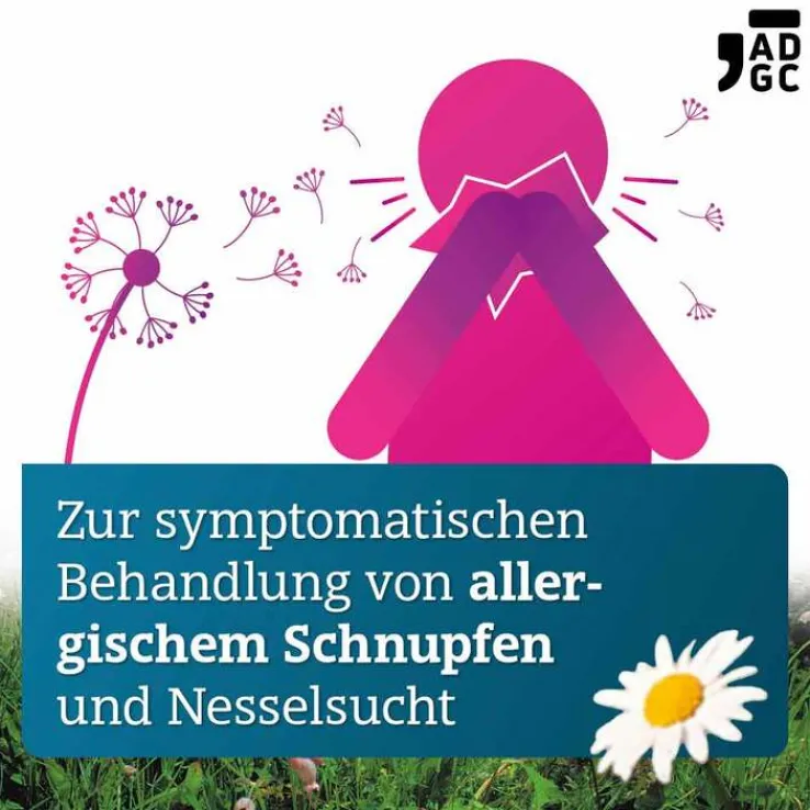 LEVOCETIRIZIN ADGC® 5 mg Filmtabletten. Wirkstoff: Levocetirizindihydrochlorid. Anwendungsgebiete: Zur symptomatischen Behandlung der allergischen Rhinitis (einschließlich persistierende allergische Rhinitis) und Urtikaria bei Erwachsenen, Jugendlichen und Kindern ab 6 Jahren. Hinweis: Enthält Laktose, Packungsbeilage beachten. Apothekenpflichtig. Zu Risiken und Nebenwirkungen lesen Sie die Packungsbeilage und fragen Sie Ihre Ärztin, Ihren Arzt oder in Ihrer Apotheke. Pharmazeutischer Unternehmer: Zentiva Pharma GmbH, 65926 Frankfurt am Main. Stand: November 2022