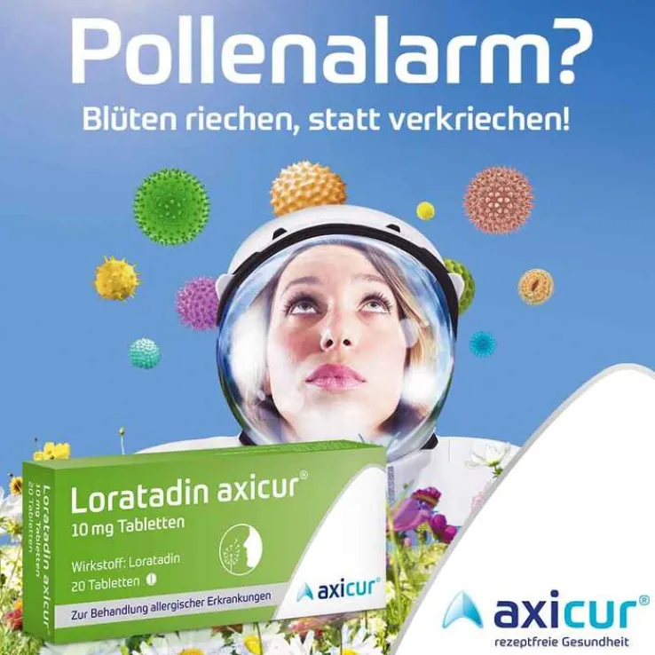 Loratadin axicur® 10 mg Tabletten. Anwendungsgebiete: Zur Linderung der Symptome bei allergischer Rhinitis (z. B. Heuschnupfen) wie Niesen, laufende oder juckende Nase und brennende oder juckende Augen bei Erwachsenen und Kindern über 2 Jahren mit einem Körpergewicht von mehr als 30 kg. Zur Linderung von Symptomen bei Urtikaria (Nesselsucht) wie Juckreiz, Hautrötung sowie Anzahl und Größe der Quaddeln. Enthält Lactose. Packungsbeilage beachten. Zu Risiken und Nebenwirkungen lesen Sie die Packungsbeilage und fragen Sie Ihren Arzt oder Apotheker. axicorp Pharma GmbH, 61381 Friedrichsdorf. Stand: April 2022