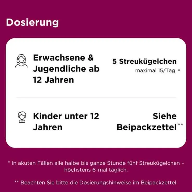 Jugendliche ab 12 Jahren und Erwachsene erhalten als Akutdosierung alle halbe bis ganze Stunde, höchstens 6-mal täglich je 5 Globuli (maximal 30 Globuli/Tag), bei länger andauernden Verlaufsformen 1- bis 3-mal täglich 5 Globuli (maximal 15 Globuli/Tag).