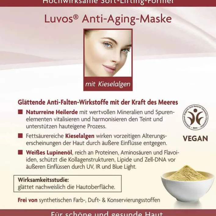 Zertifizierte Naturkosmetik, hergestellt in Deutschland: das Familienunternehmen Luvos mit 100-jähriger Tradition stellt dieses Produkt nach höchstem Standard von BDIH her. Es ist selbstverständlich vegan, tierversuchsfrei. Die Hautverträglichkeit ist dermatologisch bestätigt. Die Anti-Aging-Maske ist vollkommen frei von problematischen Zusatzstoffen wie Mikroplastik, Mineralöl, Parabenen, Silikonen, Paraffinen, PEGs, künstlichen Farb-, Duft- und Konservierungsstoffen.