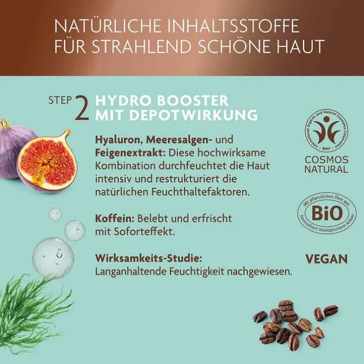 Kurz- und langkettige Hyaluronsäure, Algenmeerwasser, Feige und Koffein im Hydro-Booster durchfeuchten, polstern Trockenheitsfältchen auf und erfrischen sofort – mit Langzeit-Effekt. Die leichte Hydro-Booster-Formel verschmilzt sofort mit der Haut.