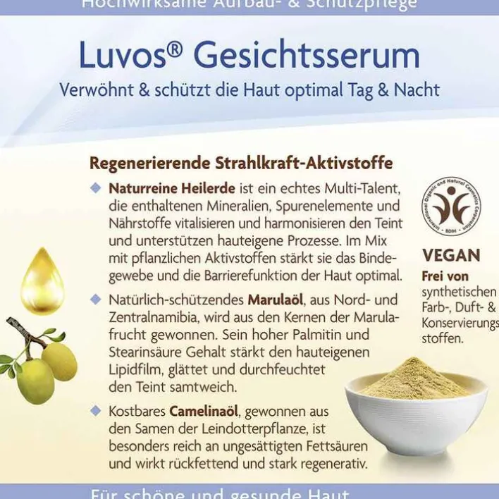 Zertifizierte Naturkosmetik, hergestellt in Deutschland: Das Familienunternehmen Luvos mit 100-jähriger Tradition stellt dieses Produkt nach höchstem Standard des BDIH her. Es ist selbstverständlich vegan, tierversuchsfrei. Die Hautverträglichkeit ist dermatologisch bestätigt. Das Gesichtsserum ist vollkommen frei von problematischen Zusatzstoffen wie Mikroplastik, Mineralöl, Parabenen, Silikonen, Paraffinen, PEGs, künstlichen Farb-, Duft- und Konservierungsstoffen.