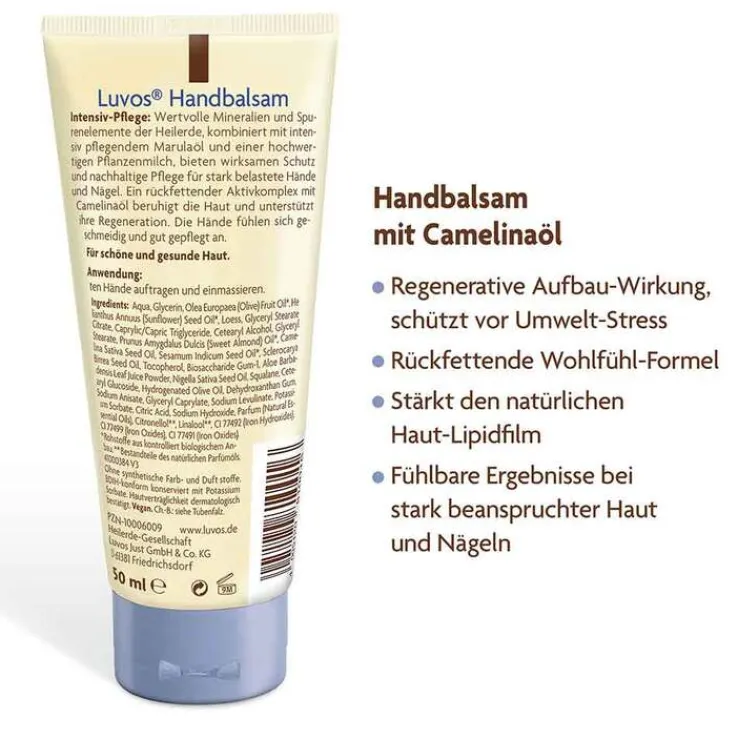 Zertifizierte Naturkosmetik, hergestellt in Deutschland: Das Familienunternehmen Luvos mit 100-jähriger Tradition stellt dieses Produkt nach höchstem Standard von BDIH her. Es ist selbstverständlich vegan, tierversuchsfrei. Die Hautverträglichkeit ist dermatologisch bestätigt. Der Handbalsam ist vollkommen frei von problematischen Zusatzstoffen wie Mikroplastik, Mineralöl, Parabenen, Silikonen, Paraffinen, PEGs, künstlichen Farb-, Duft- und Konservierungsstoffen.