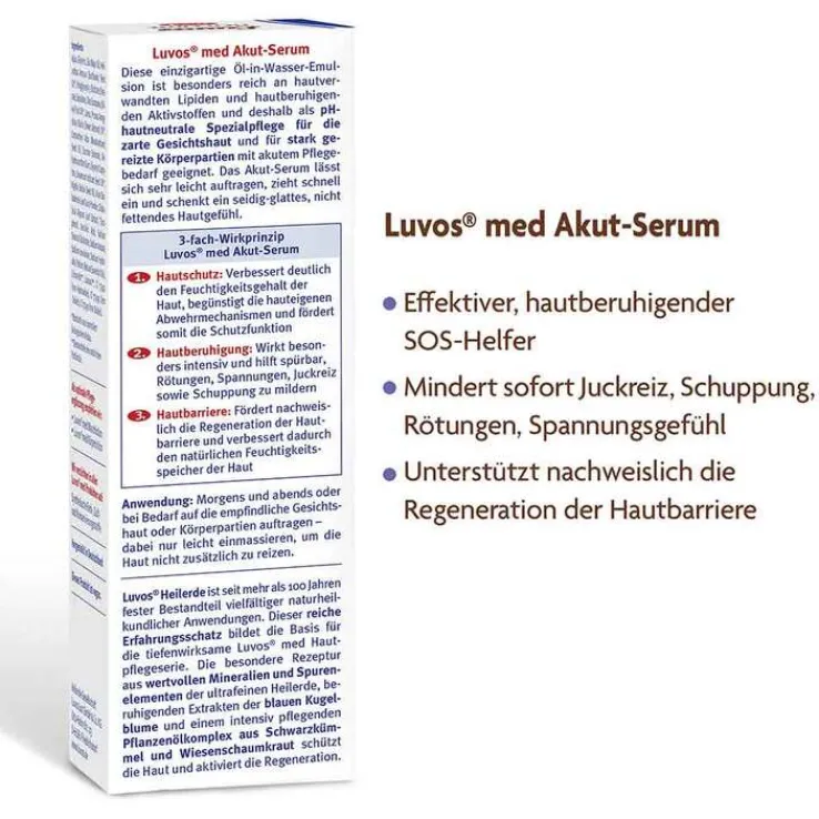 Das Luvos med Akut-Serum ist eine leichte, pH-hautneutrale kosmetische Spezialpflege mit innovativer Naturkraft-Formel, bei Hautproblemen wie Juckreiz, Schuppung, rauen Stellen, Rötungen, Spannungsgefühl. Für schöne und gesunde Haut. Die medizinische Hautpflege-Formel aus wertvoller Heilerde, Kräuterextrakten, hautberuhigenden und regulierenden Pflanzen-Aktivstoffen versorgt die Haut intensiv mit Feuchtigkeit, regeneriert, wirkt rückfettend und hilft nachweislich, die hauteigene Lipidbarriere von trockener, stark strapazierter Haut wieder aufzubauen.