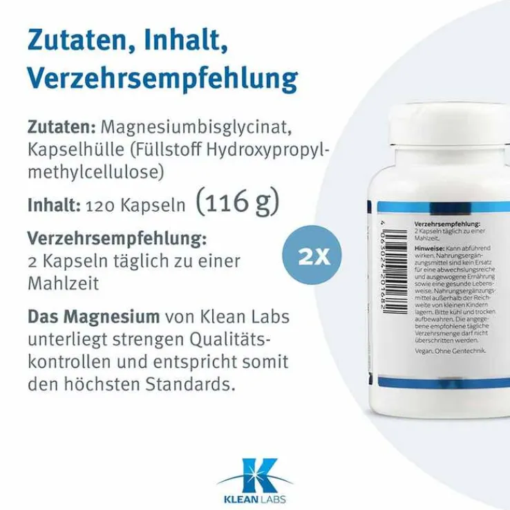 Magnesiumbisglycinat, Kapselhülle Hydroxypropylmethylcellulose, Antioxidationsmittel Fettsäureester der Ascorbinsäure.
