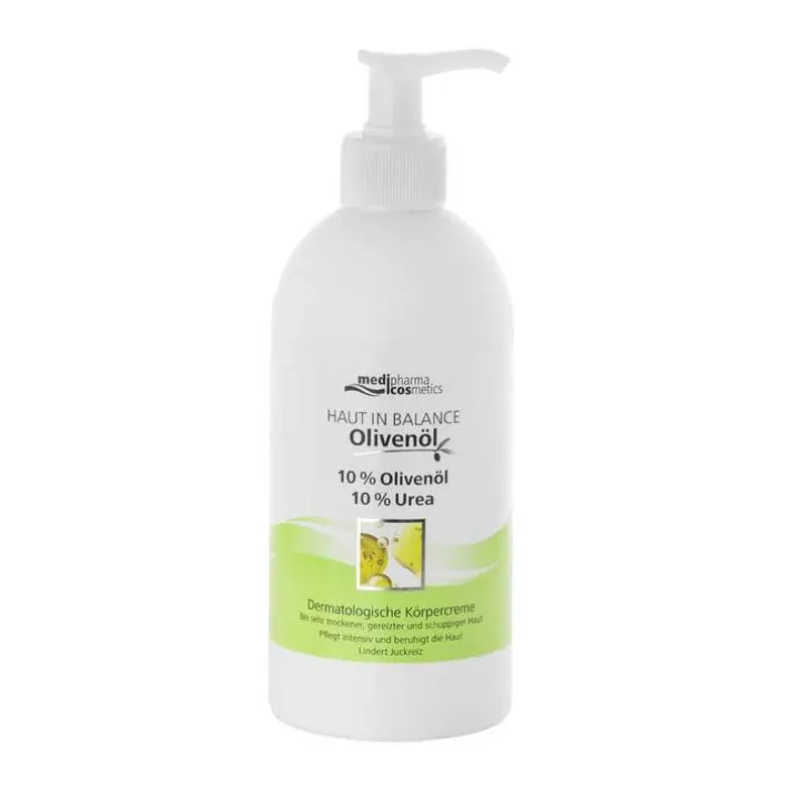 Einzigartige Wirkstoffkombination aus 10 % Olivenöl und 10 % Urea. Trockene, schuppige Haut wird intensiv mit Feuchtigkeit versorgt. Panthenol und Olivenblattextrakt pflegen nachhaltig. Die Öl-in-Wasser Körpercreme entspannt die gereizte Haut.