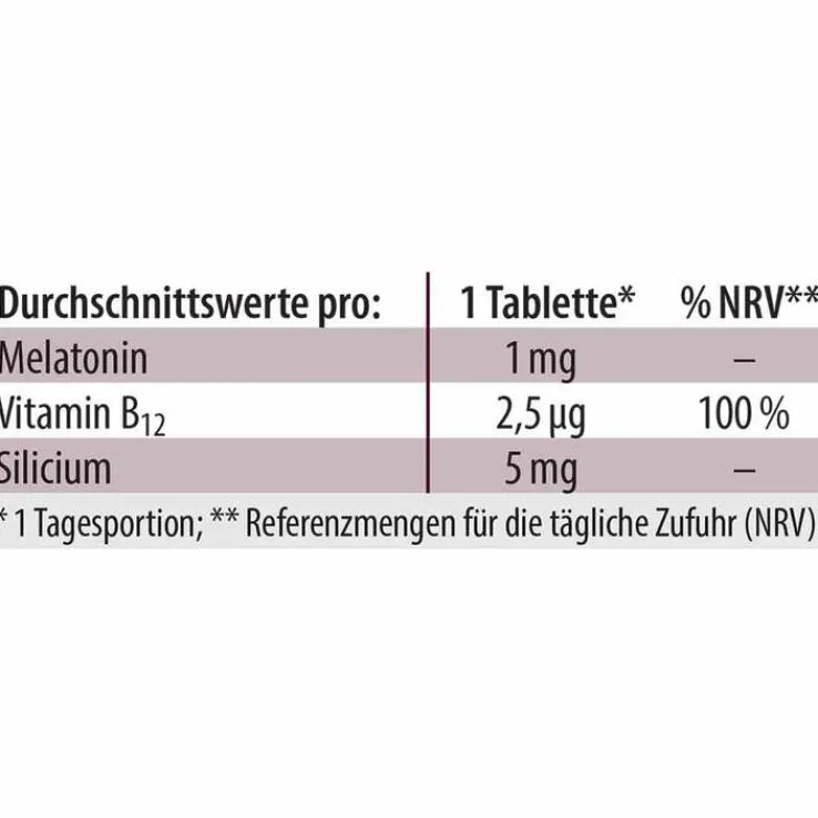 Süßungsmittel Xylit, Rapsfett, Kieselerde, Füllstoff Cellulose, natürliches Kirscharoma, Füllstoff Hydroxypropylcellulose, Rote-Bete-Saftpulver, Melatonin (0,5 %), Vitamin B12 (Methylcobalamin).