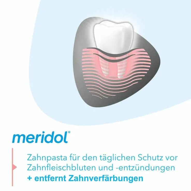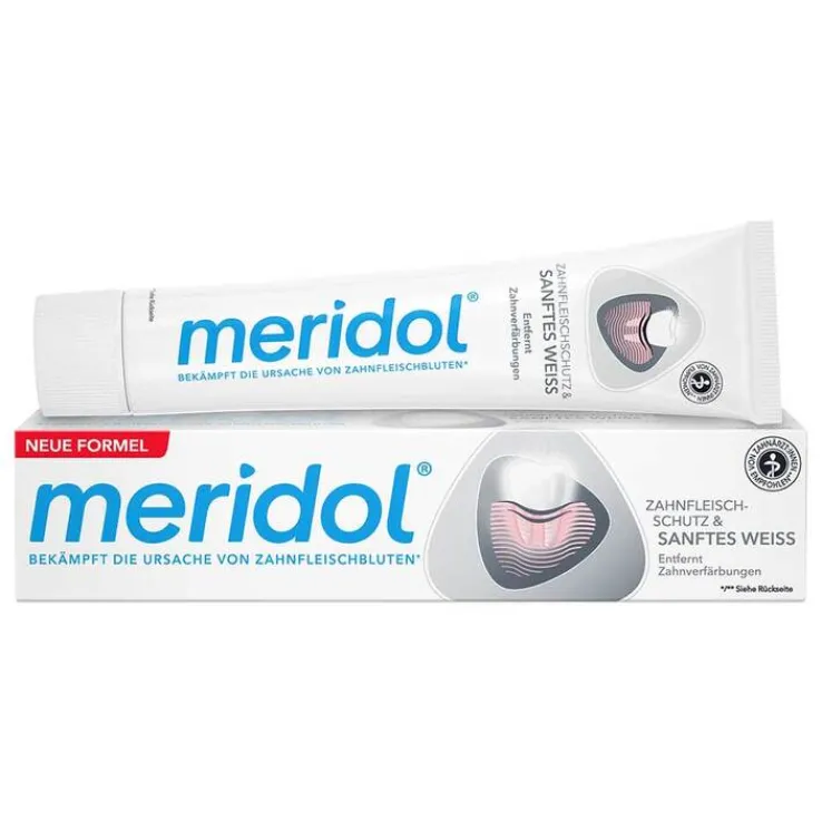Meridol sanftes Weiss Zahnpasta bekämpft die bakteriellen Ursachen von Zahnfleischentzündungen und entfernt sanft Verfärbungen auf der Zahnoberfläche.