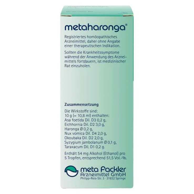 metaharonga® Mischung.Anwendungsgebiete: Registriertes homöopathisches Arzneimittel, daher ohne Angabe einer therapeutischen Indikation. Enthält 54 mg Alkohol (Ethanol) pro 5 Tropfen, entsprechend 51,5 Vol.-%. Zu Risiken und Nebenwirkungen lesen Sie die Packungsbeilage und fragen Sie Ihre Ärztin, Ihren Arzt oder in Ihrer Apotheke. meta Fackler Arzneimittel GmbH, D-31832 Springe.