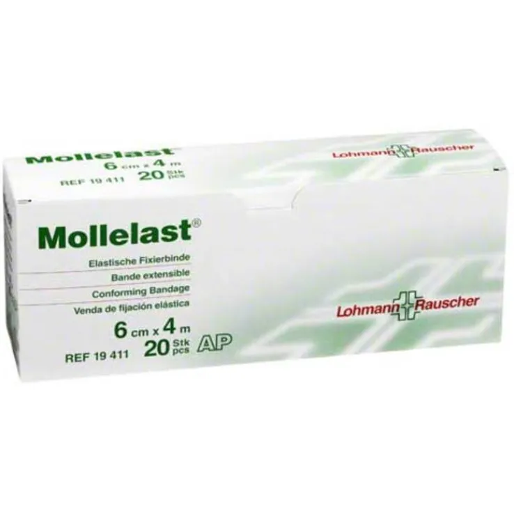 Mollelast liegt locker in der Hand, ist sympathisch auf der Haut; sie schmiegt sich faltenlos an und fixiert zuverlässig ohne einzuschnüren, besonders an konischen Körperpartien und im Bereich der Gelenke.Gewirkte Binde, weiß; elastisch, ca. 100 % dehnbar, waschbar, sterilisierbar (A 121°C).