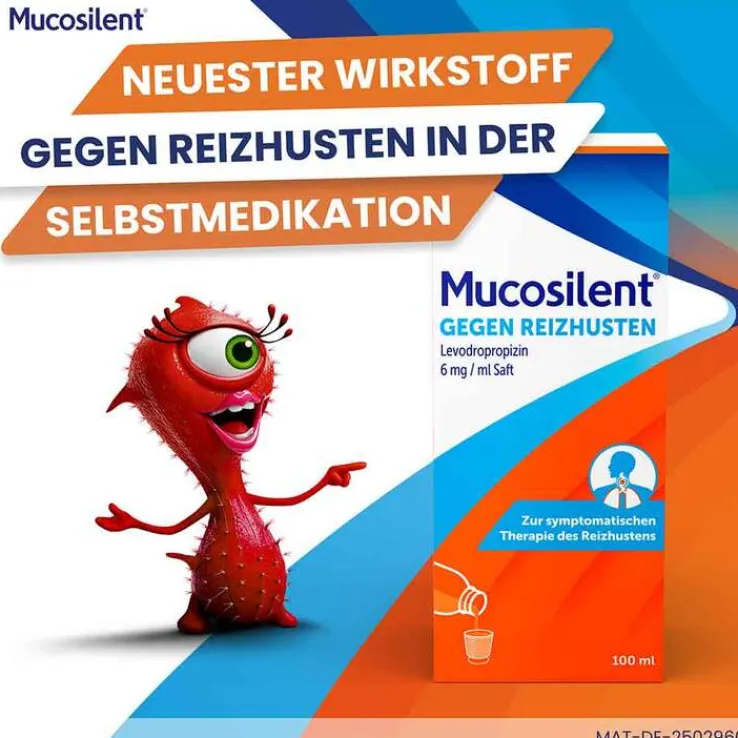 Mucosilent® gegen Reizhusten Levodropropizin 6 mg/ml Saft Wirkstoff: Levodropropizin. Anwendungsgebiet: Symptomatische Therapie des Reizhustens (unproduktiver Husten). Apothekenpflichtig. Zu Risiken und Nebenwirkungen lesen Sie die Packungsbeilage und fragen Sie Ihre Ärztin, Ihren Arzt oder in Ihrer Apotheke. A. Nattermann & Cie. GmbH, Brüningstraße 50, 65929 Frankfurt am Main. Stand: April 2025