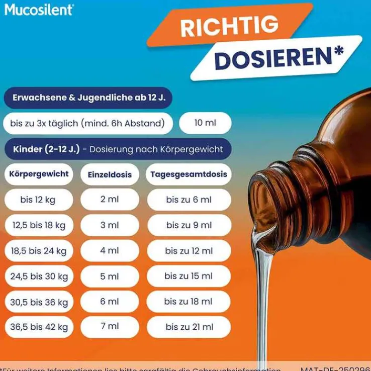 Nehmen Sie das Arzneimittel ein, bis der Husten weg ist. Mucosilent® sollte aber nicht länger als 7 Tage eingenommen werden. Wenn der Husten anhält oder sich verschlechtert, suchen Sie einen Arzt/eine Ärztin auf.