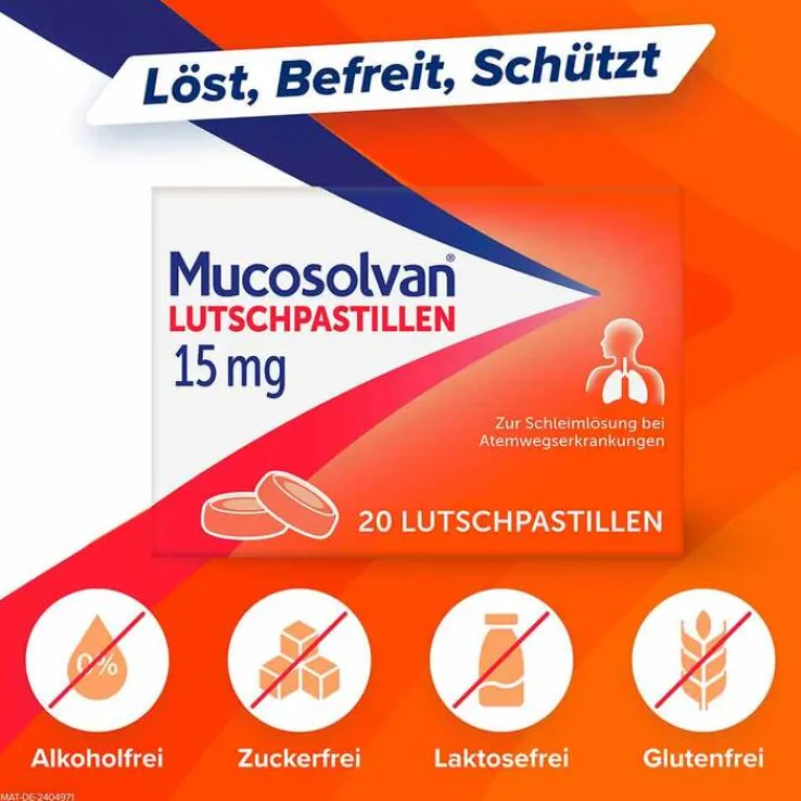 Mucosolvan® Lutschpastillen 15 mg. Wirkstoff: Ambroxolhydrochlorid. Anwendungsgebiet: Zur Schleim lösenden Behandlung bei akuten und chronischen Erkrankungen der Bronchien und der Lunge mit zähem Schleim. Warnhinweis: Enthält Sorbitol, Maltitol, Pfefferminzöl und Eukalyptusöl. Apothekenpflichtig.Zu Risiken und Nebenwirkungen lesen Sie die Packungsbeilage und fragen Sie Ihre Ärztin, Ihren Arzt oder in Ihrer Apotheke.A. Nattermann & Cie. GmbH, Brüningstraße 50, 65929 Frankfurt am Main. Stand: Juli 2022