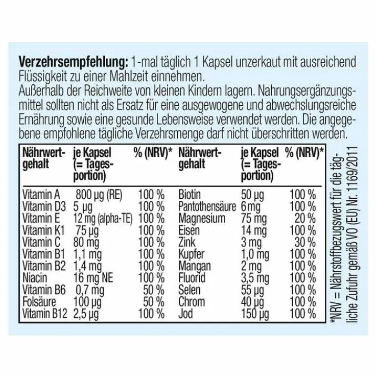 * Kupfer, Eisen, Selen, Vitamin A, B12, B6, C, D und Zink tragen zu einer normalen Funktion Ihres Immunsystems bei. Eisen, Magnesium, Niacin, B2, B12, B6 und Vitamin C tragen dazu bei, Müdigkeit und Ermüdung zu reduzieren. Vitamin B3, B6, B12 sowie Magnesium tragen zu einer normalen psychische Funktion bei. Biotin, Kupfer, Magnesium, Niacin, Vitamin B2, B6 und B12 tragen zu einer normalen Funktion des Nervensystems und zu einem normalen Energiestoffwechsel bei. Biotin, Zink, Jod, Niacin, Vitamin B2 und A tragen bei zur Erhaltung normaler Haut. Biotin, Selen, Zink tragen bei zur Erhaltung normaler Haare. Kupfer, Selen, Zink, Vitamin B2 und Vitamin C tragen dazu bei, die Zellen vor oxidativem Stress zu schützen. Kupfer trägt bei zu einer normalen Haarpigmentierung, zur Erhaltung von normalem Bindegewebe und zu einer normalen Hautpigmentierung. Selen und Zink tragen zur Erhaltung normaler Nägel bei. Kalzium, Magnesium und Vitamin D tragen zur Erhaltung normaler Muskelfunktionen, normaler Knochen und Zähne bei. Vitamin C trägt zu einer normalen Kollagenbildung für eine normale Funktion der Knochen, der Knorpelfunktion, der Zähne, des Zahnfleisches und der Haut bei. Zink trägt bei zur normalen Funktion der Knochen. Zink und Vitamin A zur Erhaltung normaler Sehkraft bei. Vitamin A trägt zur Erhaltung normaler Schleimhäute bei. Zink trägt zu einer normalen Fruchtbarkeit und einer normalen Reproduktion bei. Folsäure trägt zum Wachstum des mütterlichen Gewebes während der Schwangerschaft bei. Zink trägt zur Erhaltung eines normalen Testosteronspiegels im Blut bei. Chrom und Zink tragen zu einem normalen Stoffwechsel von Makronährstoffen bei. Eisen und Jod tragen zu einem normalen Energiestoffwechsel bei. Zink trägt zu einem normalen Kohlenhydrat-Stoffwechsel bei.