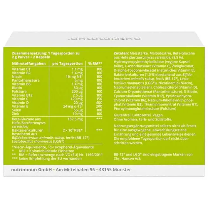 Maisstärke, Maltodextrin, Beta-Glucane aus Hefe (Saccharomyces cerevisiae) (8,5 %), Hydroxypropylmethylcellulose (vegane Kapselhülle), L-Ascorbinsäure (Vitamin C), Zinkgluconat, D-alpha-Tocopherylacetat (natürliches Vitamin E), Bakterienkulturen (1,0 %) (bestehend aus Bifidobacterium animalis subsp. lactis (BB-12®), Lactobacillus rhamnosus (LGG®)), Nicotinamid (Niacin), Natriumselenat (Selen), Cholecalciferol (Vitamin D), Calcium-D-pantothenat (Pantothensäure), D-Biotin, Cyanocobalamin (Vitamin B12), Pyridoxinhydrochlorid (Vitamin B6), Natrium-Riboflavin-5-phosphat (Vitamin B2), Thiaminmononitrat (Vitamin B1), Pteroylmonoglutaminsäure (Folsäure)