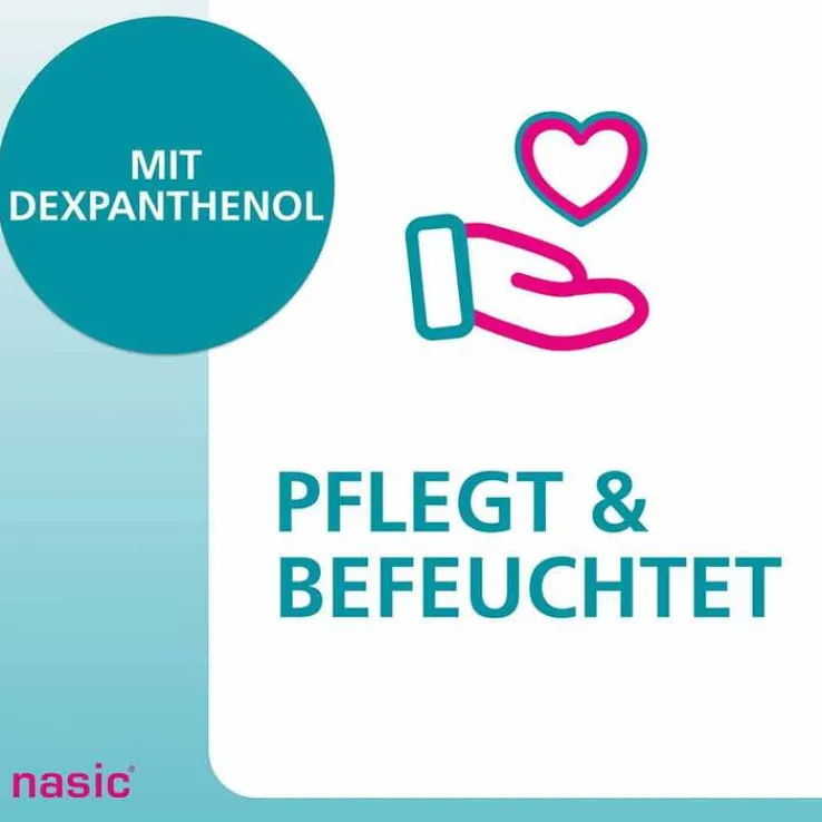 Zusätzlich pflegt und befeuchtet Dexpanthenol die gereizte Nasenschleimhaut. Die besondere Zusammensetzung von nasic® Salin Duo sorgt so für eine freie Nase und pflegt die Schleimhaut.