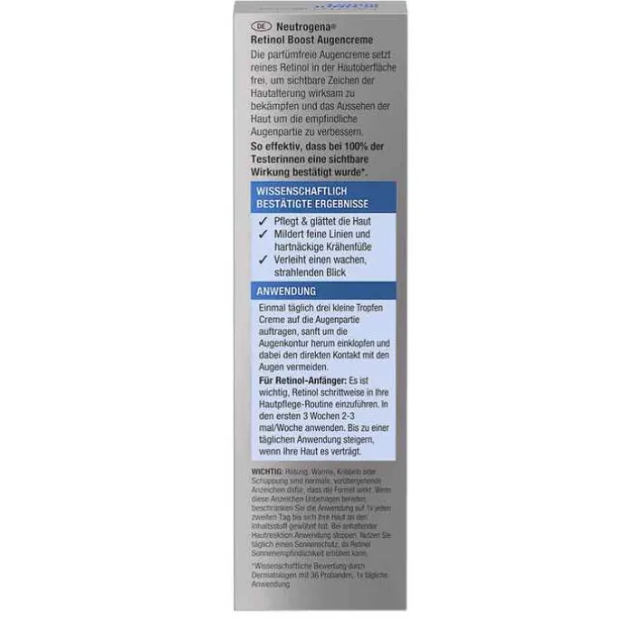 Die Neutrogena Retinol Boost Augencreme ist eine effektive Anti-Age Augenpflege mit Retinol, Myrtenblatt-Extrakt & Hyaluronsäure und sorgt für jünger & gesund aussehende Haut.