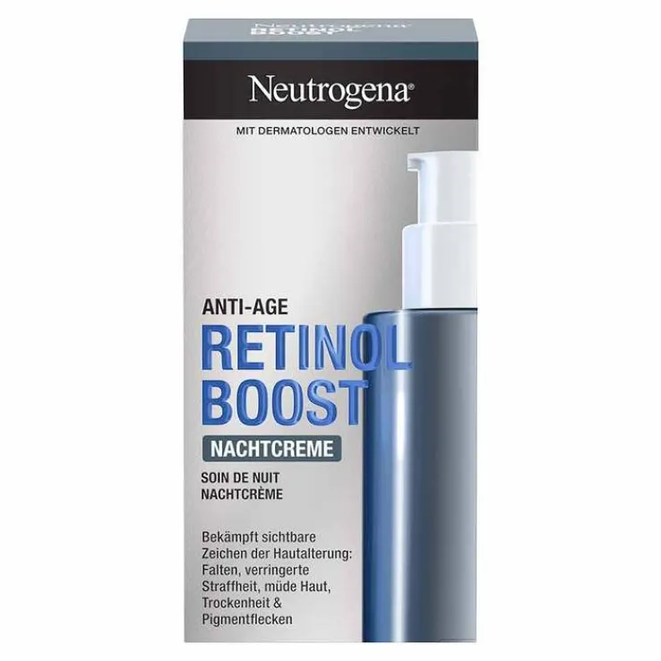 Die Neutrogena Retinol Boost Nachtcreme ist eine schnell einziehende Anti-Age Nachtpflege mit Retinol, Myrtenblatt-Extrakt & Hyaluronsäure und sorgt für jünger & gesund aussehende Haut.