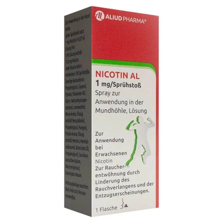 NICOTIN AL 1 mg/Sprühstoß Spray zur Anwendung in der Mundhöhle, Lösung Zur Anwendung bei Erwachsenen. Wirkstoff: Nicotin. Zur Behandlung der Tabakabhängigkeit bei Erwachsenen durch Linderung der Nicotinentzugssymptome, einschließlich des Rauchverlangens, beim Versuch das Rauchen aufzugeben. Die komplette Einstellung des Rauchens sollte das endgültige Ziel sein. Hinweis: Enthält Ethanol (Alkohol), Propylenglycol, Benzylalkohol u. Levomenthol. Zu Risiken und Nebenwirkungen lesen Sie die Packungsbeilage und fragen Sie Ihre Ärztin, Ihren Arzt oder in Ihrer Apotheke. ALIUD PHARMA GmbH, Postfach 1380, 89146 Laichingen Stand: Mai 2020