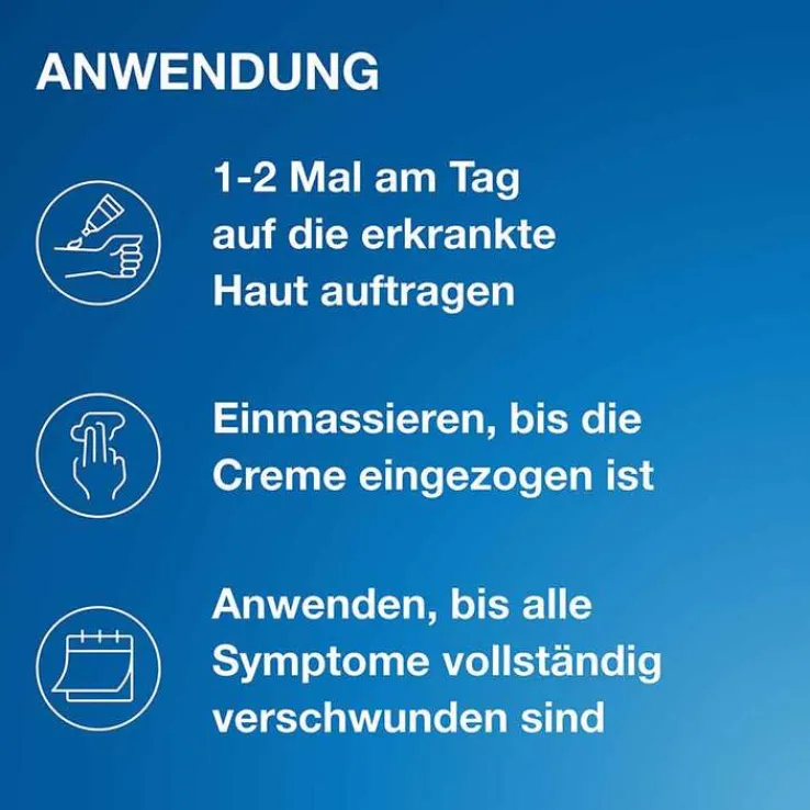 Wenn nicht anders verordnet, 1 – 2-mal am Tag auf die erkrankte Haut und die umgebende Hautfläche (ca. 1 – 2 cm) auftragen und mit dem Finger so lange einmassieren, bis die Creme eingezogen ist.