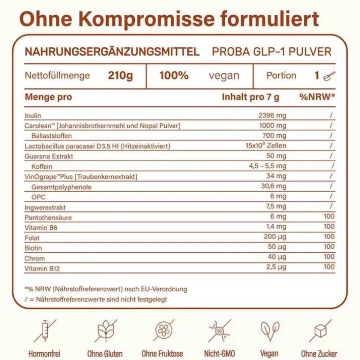 Nupure proba GP-1 ist glutenfrei, fructosefrei, gentechnikfrei, vegan und enthält keinen Zuckerzusatz.