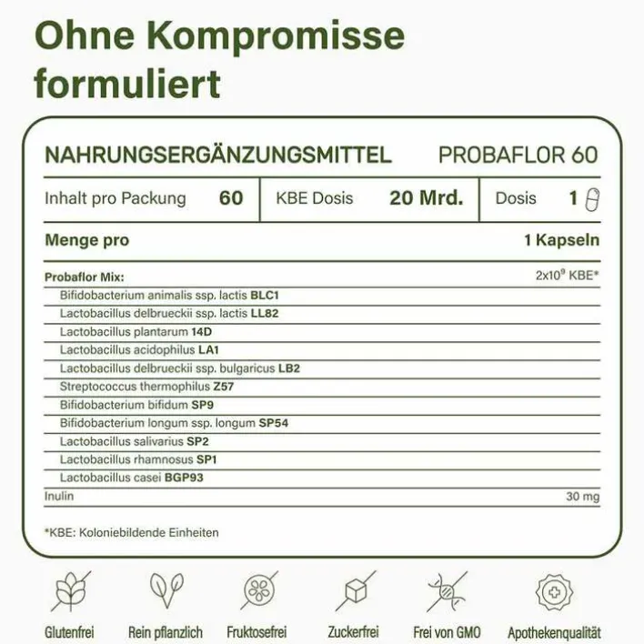 Bifidobacterium lactis, Inulin, Lactococcus lactis, Lactobacillus plantarum, Lactobacillus acidophilus, Streptococcus thermophilus, Bifidobacterium longum, Lactobacillus rhamnosus, Lactobacillus bulgaricus, Bifidobacterium bifidum, Lactobacillus salivarius, Lactobacillus casei. Füllstoff/Bulking agent: Maisstärke/corn starch, Modifizierte Stärke/Corn starch pregelatinized. Kapselhülle/Capsule shell: Hydroxypropylmethylcellulose, Gellan. Trennmittel/Anticaking agent: Magnesium stearate