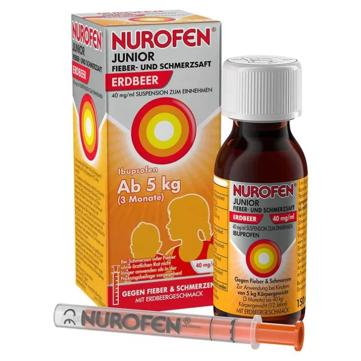 Der NUROFEN® Junior Fieber- & Schmerzsaft 40 mg/ml ist eine flüssige Ibuprofen-Suspension zur Fieber- & Schmerzlinderung bei Kindern ab 6 Monaten und einem Gewicht ab 7 kg. Er sorgt für schnelle und langanhaltende Fiebersenkung – in 15 Minuten für bis zu 8 Stunden. Er ist in den Geschmacksrichtungen Erdbeer und Orange erhältlich, die beide gut von Kindern angenommen werden. Dank der beigefügten Dosierspritze kann die Suspension genau nach Alter und Gewicht passend dosiert und sicher verabreicht werden.