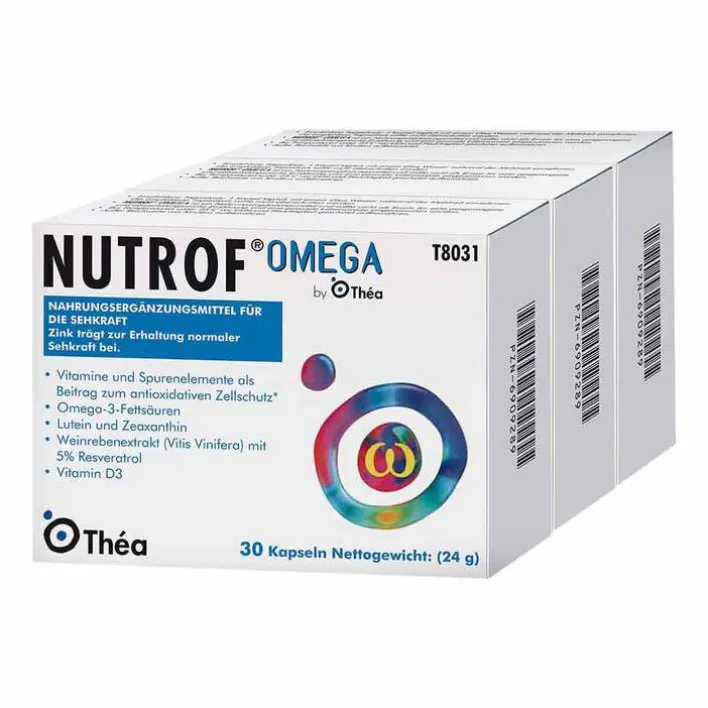 Das Nahrungsergänzungsmittel Nutrof Omega enthält Vitamine und Spurenelemente, Lutein, Zeaxanthin, mehrfach ungesättigte Omega-3-Fettsäuren (enthält DHA und EPA), Weinrebenextrakt (Vitis Vinifera) mit Resveratrol*.