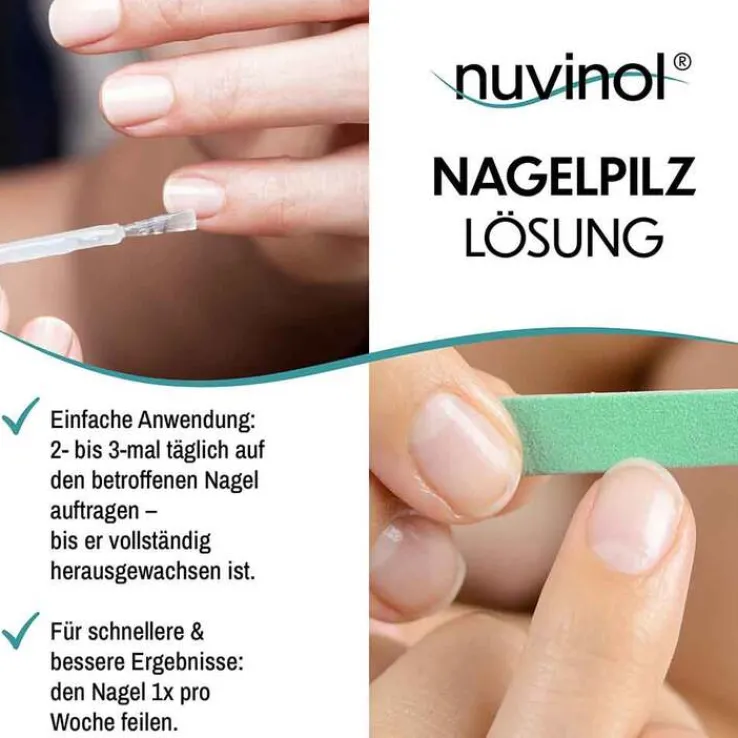 Um schnellere und bessere Ergebnisse zu erzielen, wird empfohlen, den vom Pilz befallenen Nagel einmal pro Woche sorgfältig zu feilen. Wenn die Behandlung abgebrochen wird, kehrt der Nagelpilz schneller zurück. Es ist daher wichtig, Nuvinol Nagelpilz Lösung weiterzuverwenden, bis der Nagelpilz vollständig verschwunden ist.