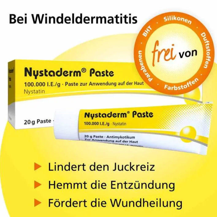 Nystaderm® Paste, 100.000 I.E./g, Paste zur Anwendung auf der Haut Wirkstoff: Nystatin Anwendungsgebiete: Hautinfektionen mit Nystatin-empfindlichen Hefepilzen wie z.B. Windeldermatitis. Stand: 02/2020 Zu Risiken und Nebenwirkungen lesen Sie die Packungsbeilage und fragen Sie Ihre Ärztin, Ihren Arzt oder in Ihrer Apotheke.