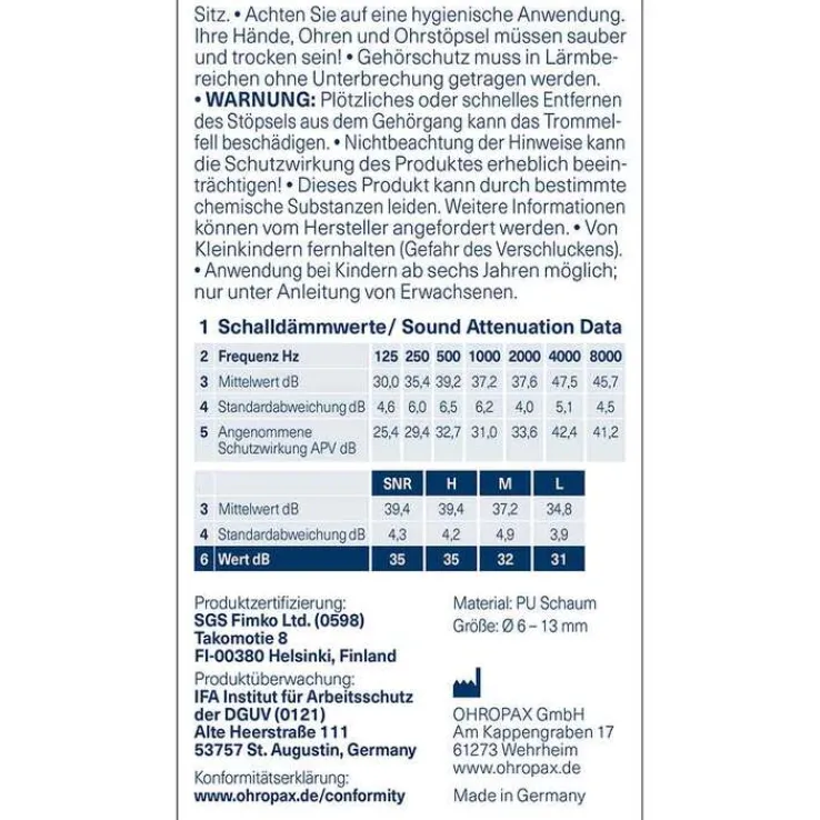 - Gehörschutzstöpsel aus Schaumstoff gegen schädlichen Lärm zur einmaligen Verwendung (EN 352-2:2020, EU 2016/425)