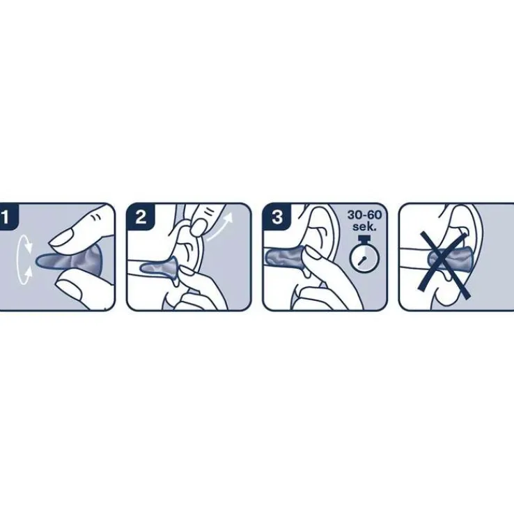 - Mit einer Hand über den Kopf greifen und das Ohr etwas nach oben ziehen, mit der anderen Hand den gerollten Stöpsel tief in den Gehörgang einführen.