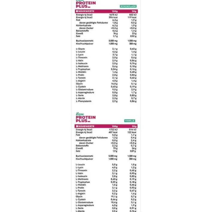 Ackerbohneneiweiß, Erbseneiweißisolat, Glycin, Reiseiweiß, Sonnenblumeneiweiß, Buchweizenmehl, natürliches Aroma, Kiwifruchtpulver, Süßungsmittel (Steviolglykoside aus Stevia)